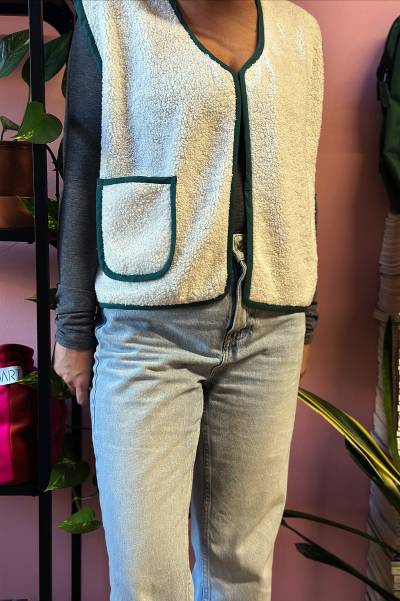 Crafted from a soft Bouclé fabric, it adds warmth without bulk, making it ideal for winter outfits, transitional weather, and indoor layering. The green binding gives a modern, earthy contrast that pairs beautifully with denim, knits, and neutral basics. Finished with a rounded front pocket for extra coziness and functionality.