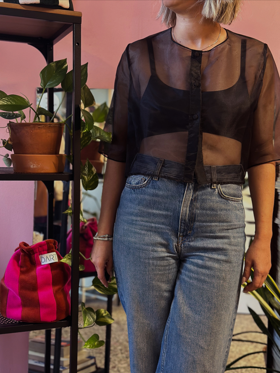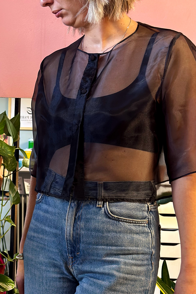 Its cropped silhouette gives it a modern, playful edge, while the translucent texture keeps it romantic and easy to layer. Wear it over a simple tank, a bralette, or your favourite dress and let it transform even the simplest look.